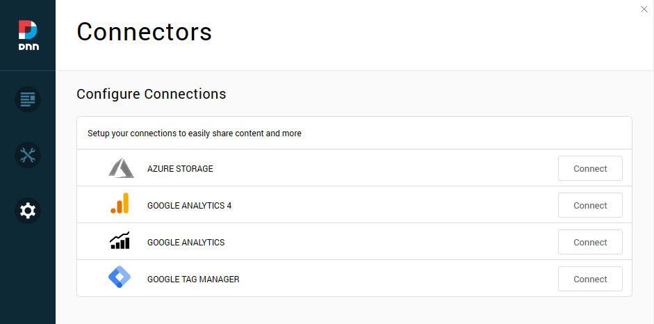 - Klik op "Connect" achter de "GOOGLE ANALYTICS 4" connector;